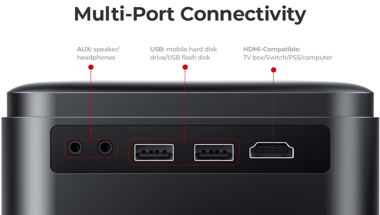 Conexión Multipuerto Auxiliar 3.5mm / HDMI / USB