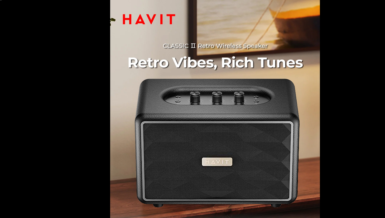 Altavoz inalámbrico Havit Classic II Retro Home. Es un altavoz portátil que combina un estilo retro con tecnología moderna para mejorar el ambiente del hogar.