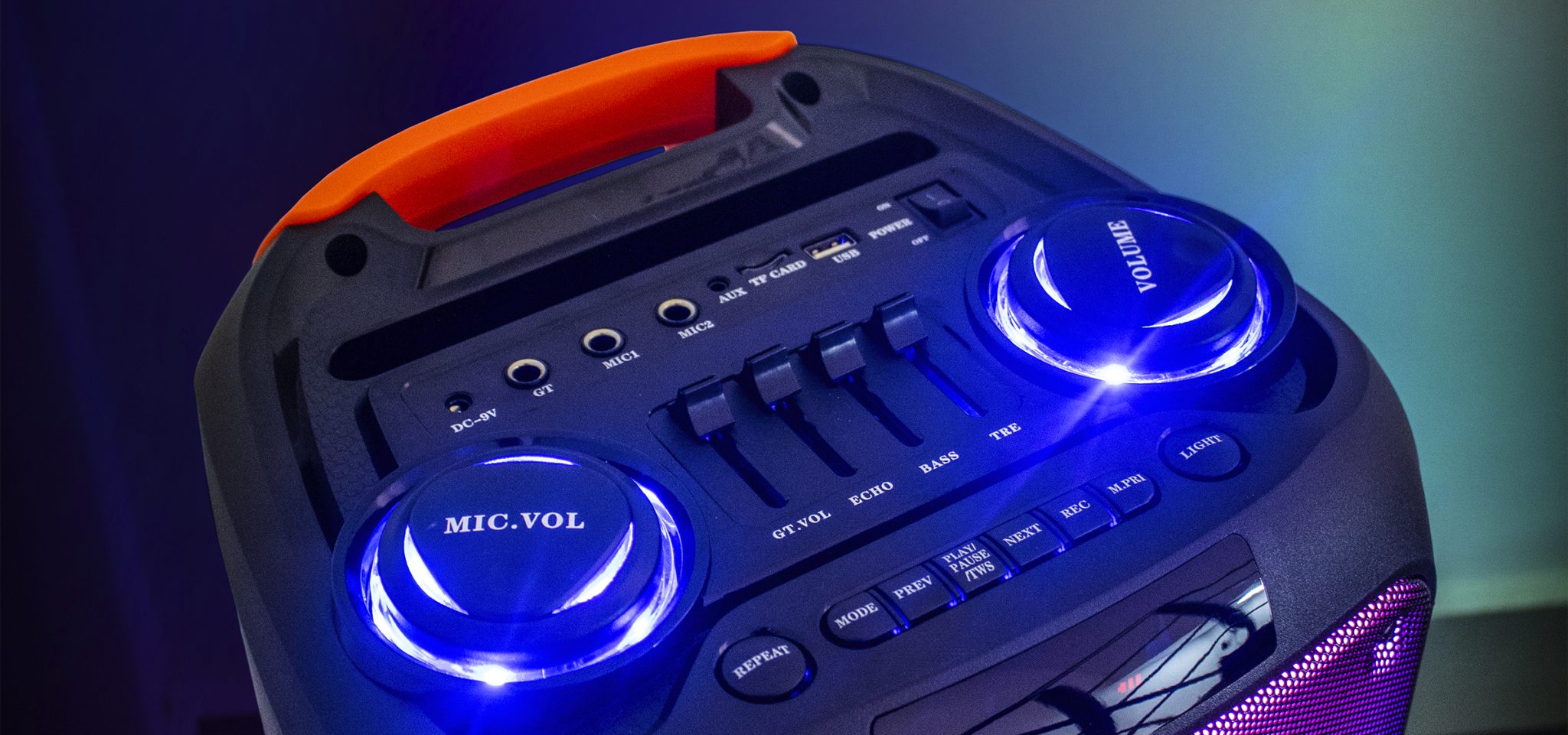 Parlantes Bluetooth con batería recargable de larga duración, luces RGB y un micrófono inalámbrico.