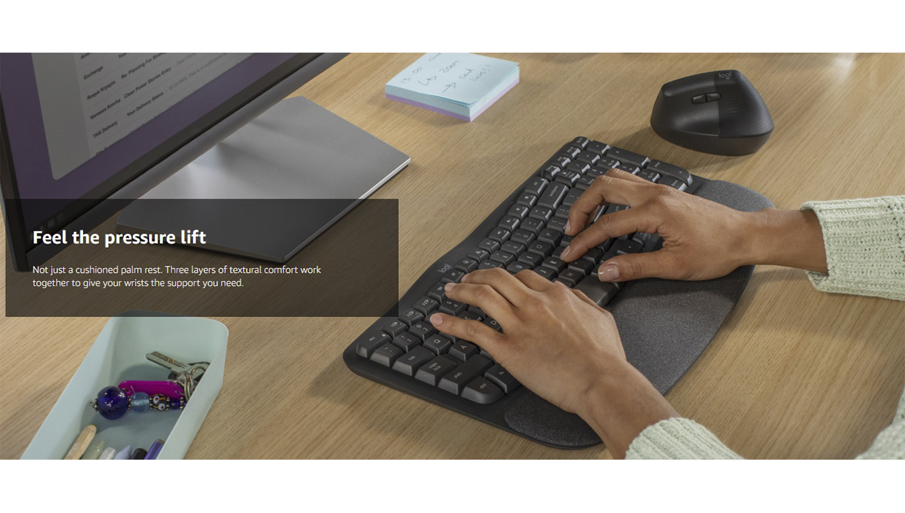 Escribe con comodidad durante todo el día: el diseño ondulado de este teclado compacto coloca tus manos, muñecas y antebrazos en una posición de escritura natural.